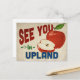 A charming Upland California vintage travel postcard featuring a lovely red apple, along with fun retro style text that says, "See you in Upland"