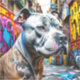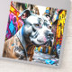 Colourful digital art with a Pitbull sitting on a city street surrounded by graffiti street art.