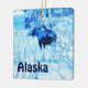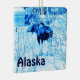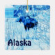 A blue and white image of a cow moose in an urban setting during winter. Customizable text reading "Alaska" also appears. Moose are year-round residents in many Alaskan communities. Here in Anchorage there are about 1500 animals, along with wolves, brown bears and other wildlife.They are usually well-behaved. They often cross streets at the crosswalks after waiting for a walk signal.