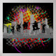 An illustration of a city skyline in greys and a figure on a skateboard doing an aerial pirouette in front with a colourful grunge background.