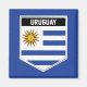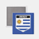 The national flag of Uruguay is infused into a hand drawn shield shape, and set above the flag is the country name.