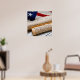 Copies of the Declaration of Independence and US Constitution in rolled up scrolls with a vintage American flag