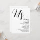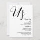This elegant, modern wedding invitation features a black and white theme. The title "Us" is printed in a large script font at the top, above the couple's names getting married. The wedding information is printed below in a sophisticated black font.