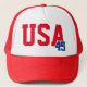 A red, white and blue hat with the words USA 45. This has is similar to the one that Trump sometimes now wears since he's the 45th president.