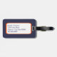 This patriotic luggage tag features a portrait of a fierce American bald eagle in front of the star spangled American flag. The back of the tag has your custom text in dark blue on a white field lined in red, and then placed on a dark blue background.