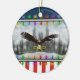 A beautiful holiday USA patriotic eagle round ceramic double sided ornament. This ornament features a flying eagle in a snowy winter background, holding a yellow ribbon. It almost appears as if he is flying off the ornament. The top and bottom of ornament background is blue and red and white stripes as the American flag. There are multicolored glowing Christmas lights across the top and bottom. It is a great addition to any ornament collection, a great gift for a veteran or someone currently serving in the U.S. military, or a patriotic collector. The art is displayed on both sides of the this round shaped ornament. This design is available on different shapes and styles of ornaments and other wonderful gift items too. For more military Christmas holiday themed styles of ornaments, gifts, stickers, tags, cards, stamps and much more please visit our store!