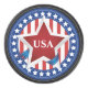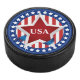 Des étoiles et des rayures rouges, blanches et bleues avec le texte américain sur cette rondelle de hockey colorée.