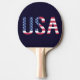 This patriotic theme custom ping pong paddle with USA text American flag containing whit stars, red and white strip pattern on custom dark navy blue background has a modern trendy style.