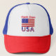 Personalized trucker hat featuring the flag of the United States of America, or, American flag with the letters USA below in the red, white and blue with stars and stripes, found in the flag. Personalize the trucker hat by adding a name, for yourself or a creative gift. Great for travel groups, clubs, or family reunions. Fun gift for any occasion or event. Dad would love it for Father's Day. Fun to wear on Independence Day/4th of July.