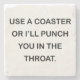 USE A COASTER OR I'LL PUNCH YOU IN THE THROAT. COASTER HUMOR. HILARIOUS DRINK COASTER. DON'T DAMAGE MY TABLE TOP! PROTECT YOUR COFFEE TABLE WITH THIS DRINK COASTER. HILARIOUS COASTER SAYINGS. USE A COASTER OR I'LL PUNCH YOU. PERFECT GIFT FOR THE FURNITURE OBSESSED FRIEND. DRINK RINGS MARKS. SWEATY DRINKS. NEW HOME GIFT. HOUSE WARMING GIFT.