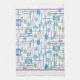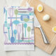 Les accessoires et outils amusants de la cuisine sont collés sur une serviette de cuisine pratique pour une pop de fantaisie moderne et pratique dans votre cuisine. Spatula, whisk, cuillères, fourchettes et couteaux se combinent pour un peu ludique de couleur rétro cool dans les tons bleu, violet, turquoise et gris.