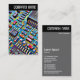 A vertical business card template with a black header with an image on the front. Company name in the header on the front and back with All other contact details on the back. The photo or image on the front can also be changed. The design also allows plenty of scope for additional customization.