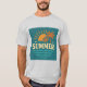A retro summer design featuring palm trees, ocean waves, and a warm sunset with birds in the sky.
