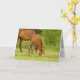WildWindArt.com's own through bred foals, nommé Storm, étirant ses pattes avant pour son premier goût d'herbes de pâturage au printemps, sous le regard de sa mère. Le message intérieur est MOTIVATIONNEL disant "Allez bébé, allez !" Connaissez quelqu'un qui a besoin d'inspiration... ou de motivation ?