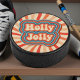 Retro Christmas Holidays Holly Jolly Typographie Hockey Puck présente un scénario rétro festif "Holly Jolly" dans la typographie moderne accentué sur un arrière - plan de rayon de soleil. Parfait pour les cadeaux et les faveurs de Noël. Conçu par © Evco Holidays www.zazzle.com/store/evcoholidays