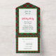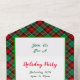 Une fête de vacances modifiable Enregistrer la date modèle d'invitation tout-en-un avec des lettres de script et un arrière - plan rétro motif de plaid rouge et vert et de la place pour vos informations de fête.