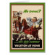 This is a World War II vintage illustration for a poster from the archives of the U.S. Department of Transportation. The illustration shows a relaxed man leaning back in his chair smoking a pipe. His English setter dog is curled up at his feet. At the top it says "Me travel?" At the bottom of the image are the words: "...not this summer" followed by "Vacation at Home." This wonderful illustration is very appropriate today. It was created by artist/illustrator Albert Dorne.