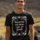 Easily add your favourite text or saying to this customizable T-shirt. The text, text colour and the colour of the surrounding floral pattern are all customizable. Current text, which can be kept if desired, reads "Tomorrow will take care of itself!"