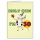Le texte lit "la vache sainte que j'ai 30ans sur le 30ème T-shirts d'anniversaire, les tasses, les cartes, les boutons, le magnet, les timbres-poste, et d'autres 30èmes habillement et cadeaux d'anniversaire avec une vache mignonne à bande dessinée dans un casquette de partie tenant un cadeau d'anniversaire et un petit gâteau d'anniversaire !