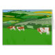 Illustration de trois vaches brunes et blanches paissant dans un champ vert avec vue sur les prés et la campagne au loin. Image disponible sur divers cadeaux et produits.