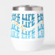 Ce caisson en verre de vin est parfait pour un cabine de lac ou un passionné de bateau. Le texte bleu "LAKE LIFE" est répété dans différentes nuances de bleu, avec l'écriture orange au centre qui dit aussi "lake life". Le motif est répété autour du périmètre du tumeur et est placé sur un arrière - plan blanc.