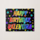 This lively and vibrant birthday-themed jigsaw puzzle design features the message "HAPPY BIRTHDAY, VALENTINA" with the characters having a colorful rainbow spectrum inspired gradient pattern, along with a fun field of stars background pattern. A colorful puzzle like this might be a fun way to send a birthday greeting message to somebody named Valentina. [~Z0000468]