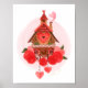 Red roses adorn a charming wooden cuckoo clock with heart-shaped accents. Original illustration by Noël Snow.