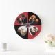 Personalized Valentine's Day large round clock with 4 heart shaped photos on red and black background .