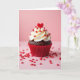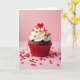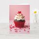 This design shows a close-up chocolate cupcake set against a soft pink background. The cupcake sits in a deep red paper liner with neat folds around the sides. On top, there’s a tall swirl of pale cream frosting with smooth ridges that catch the light. Small red heart sprinkles are scattered across the frosting, and one larger red heart sits right at the peak like a topper. A few more red hearts rest on the pink surface around the cupcake, with some in sharp focus and others softly blurred in the distance. There isn’t any text on the card, so the cupcake and hearts do all the talking for a sweet, romantic feel 💕❤️. Share it with someone special and pass along a little extra love this Valentine’s Day.