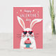 This card shows a white rabbit on a soft rose-pink background, looking sweet and calm. Its long ears have light pink tips, and its face is framed by big red heart-shaped sunglasses that make it look extra loving 💘. The rabbit holds a cupcake with swirled pink frosting and a single red cherry on top, like it’s offering a treat to someone special. Above the rabbit, the text reads “happy VALENTINE’S day,” with “happy” in smaller letters and “VALENTINE’S” in larger all-caps. The letters look like a mix of simple printed text and flowing cursive, and the words sit near the top of the card. Small red and pink hearts float around the message to match the theme ❤️. The overall scene feels warm, friendly, and perfect for romance or close friendship 😘.