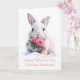 Cute and sweet happy wedding anniversary on Valentine's day. You can change the text. A darling white rabbit in the snow holding a little bunch of roses.