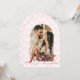 This design features a Love - themed Valentines day photo card in arch shape with arch photo on a love heart pattern in pink, white and red colours. This card can be easily edited with your personal photo and family name.