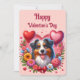 Valentine's day card featuring a blue-eyed Australian Shepherd with flowers and balloons.