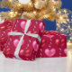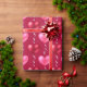 This Valentine's Day wrapping paper features a fun pattern of large and small heart-shaped pink and red balloons with silver streamers on a red background.