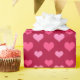 This Valentine's Day wrapping paper features a pattern of large and small hearts in two shades of pink on a red background.