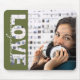 Dark green mouse pad, by red_dress, featuring a custom photo and the words, on dark green background, "Love is all you need".