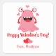 Cute monster, personalized Valentine's Day stickers. Sticker features, "Happy Valentine's Day!" in red script with red and pink hearts. Adorable red and pink cartoon monster with template text line for your name. Perfect for children's school parties, office favours, etc..