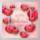 Happy Valentine's Day festive sparkle glitter light pastel pink rose background illustration with red realistic 3D hearts and white frame. Text written in modern script letters.