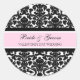 Bride and Groom custom name sticker envelope seals for Valentine's Day themed wedding, with elegant and modern light pastel blush pink, black and white vintage floral damask pattern. Fully customizable with your own text, the perfect addition to your Valentine's Day wedding invitations.