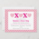 Pretty pink invitation cards for your Valentine's Day Party. Love hearts and kisses across the top. Below are templates to add your details. The background is pink with a pattern of tiny pink love hearts.