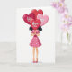 This greeting card shows a woman standing under a bunch of shiny heart-shaped balloons that cover most of her face. The balloons fill the top of the card in reds and pinks, and they look like they’re floating upward on thin strings. Each balloon has simple text on it, including “kiss me,” “love you,” and “hug me,” printed in easy-to-read letters right across the center of the hearts. The largest deep red heart sits in the middle and reads “love you,” and it blocks her face so the message stands out most. Below the balloons, she wears a rosy pink dress with small white polka dots, a darker pink ribbon at the waist, and matching pointed heels. A bit of her dark hair peeks out from behind the balloons, and the background is plain white so the hearts and messages are the main focus. It feels sweet and romantic, like a small reminder to say what you feel ❤️
