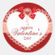 Beautiful and elegant Valentine's Day round sticker with a flourished border heart, red bow sitting on a deep shades of red hearts background. Just gorgeous and perfect for business or personal use. Also, see our matching greeting card in our Valentine's Day Cards section.