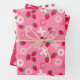 A set of three modern and whimsical coordinating wrapping paper sheets, each featuring a different pattern of Valentine's day sweet treats: 1. X and O iced sugar cookies with strawberries on a barbie pink background, 2. plain, chocolate, and yogurt covered strawberries on a cream background 3. pink heart shaped lollipops on a red background.