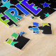 This vibrant, fun, birthday-themed jigsaw puzzle design features the message "HAPPY BIRTHDAY, VALERIE" with the characters having a colorful rainbow spectrum inspired gradient pattern, along with a lively star shapes background pattern. A colorful puzzle like this might be used to send a birthday greeting message to somebody named Valerie. [~Z0000468]