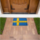 This custom door mat features an image of the flag of Sweden across the background. The flag is a bold and simple blue with a yellow cross. The phrase in the centre says Välkommen which is Swedish for "welcome" and is printed across the yellow banner in the centre of the Swedish flag.