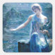 Young women in filmy gown sitting on a castle wall holding her helmet and sword. Fine art by Edward Robert Hughes c1915.