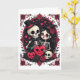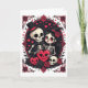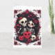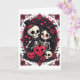 A richly stylized, folk-art illustration centered on a loving skeleton couple. They sit close together inside an ornate oval frame filled with tiny red hearts. The male skeleton wears a tilted top hat and a little bow tie, his bony arm draped lovingly around the female. The color scheme is limited but striking: clean bone white, deep black, and saturated reds and pinks, giving the composition both a warm, romantic feel and a decidedly gothic edge. Día de los Muertos–inspired tableau that feels both tender and playfully eerie.