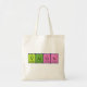 These bags were super cute (I purchased 3). The material is more of a canvas look & feel. The colour of the bag is slightly off white, but the letters look exactly as pictured. I took 3 photos in different lighting. Would recommend! I liked how there was an option to choose the font and colour of the name. The words are legible and the colours are exactly as pictured.