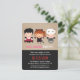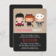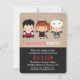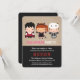 Invite kids over for a Halloween dressed up party with this cute and colourful Halloween party invitation! It has a cartoon design of kids in various fun costumes which include the boy in a little vampire outfit with black cape and red vest, a girl in a kitty girl outfit with cat ears, paws and tail, a boy in a skeleton costume with a skull mask and a bones outfit. An invite that is going to get the children guests excited for the spooky fiesta! Grungy texture background and black jagged space for party personalisation.