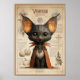 A creature called 'Vampurr,' a cat-like vampire. The creature has large, bat-like ears with orange interiors, big eyes, and small fangs. It wears an orange cape with a pentagram pendant. The background resembles a page from a bestiary, with sketches and descriptions of garlic, silver cross, and catnip as countermeasures. Perfect gift for cat lovers.
